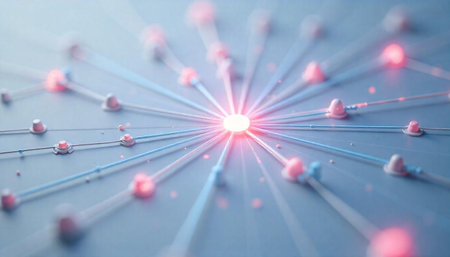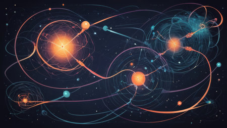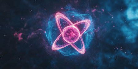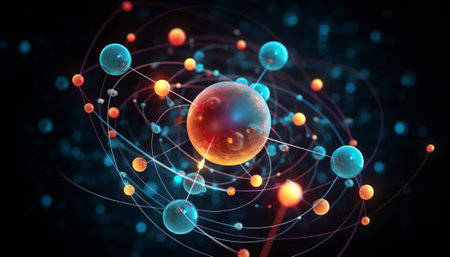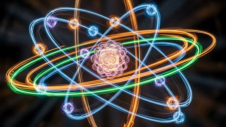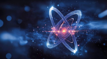 Abstract Conceptual Illustration of Atoms and Nuclei Surrounded by Glowing Energy in Cosmos