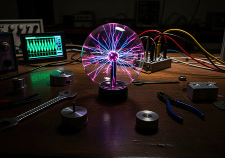 Vibrant plasma globe emitting electric arcs on a dark workbench, surrounded by an oscilloscope displaying a waveform, electronic components, and various tools, suggesting a scientific experiment or workshop environment.