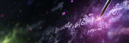 Engagement with fascinating mathematical equations appears against a vibrant cosmic backdrop of swirling colors and stars, inviting wonder and exploration.