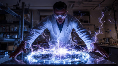 Man in white lab coat and goggles producing electrical discharge in laboratory setting