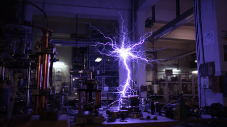 A stunning display of electric arcs in a laboratory, showcasing vibrant colors and sparks. The high-energy scene captures the essence of scientific innovation and electricity.