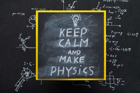 keep calm and make physics says message on board. exact sciences and academic research. formula written on chalkboard.