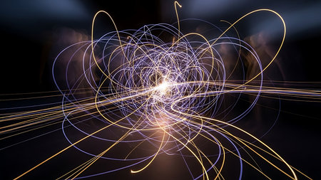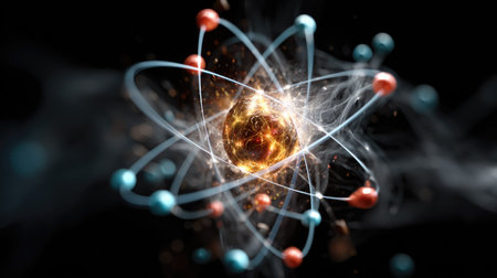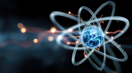 This captivating digital artwork presents an atomic structure visualization, showcasing electrons orbiting a glowing nucleus against a dark backdrop, symbolizing science.