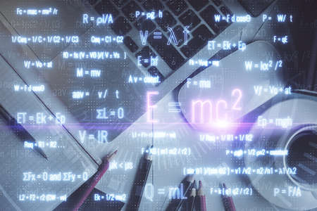 Physics and math theme hologram with formula drawings over computer on the desktop background. Top view. Multi exposure. Concept of education.