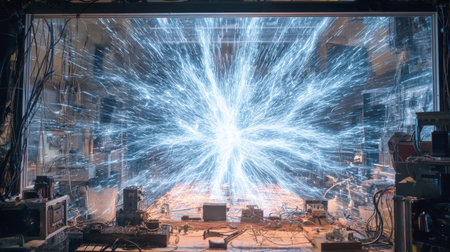blue energy discharge and particle explosion in lab setting. Electrical beam radiates from a central point, surrounded by intricate electronics, wires, and equipment, symbolizing advanced physics, power, or experimental research.