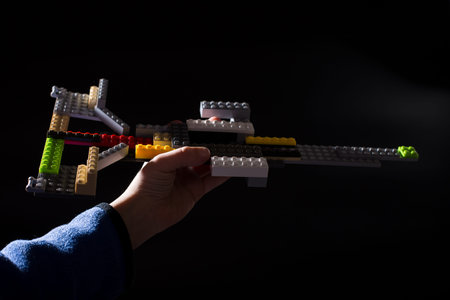 Toy robot made from toy plastic colorful blocks. Dog toy.