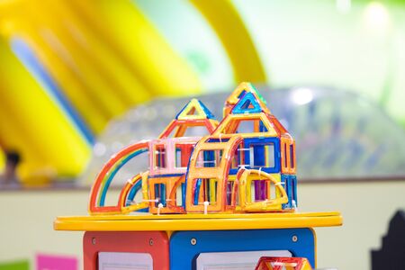 Bright magnetic constructor for children: creating shapes from sticks and balls. Development and logic.