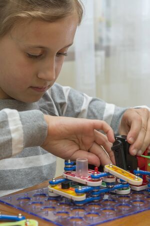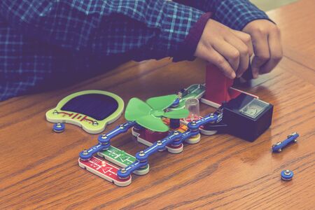 The boy playing an electric constructor. The child is played by intellectual toys. A boy in a blue shirt masters electronics. The concept of early development of children. toned.