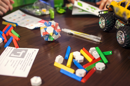 Close up kid hands creating toy from constructor. Toys of future concept. Education, children, technology, science and futuristic concept. E-learning. toned. verical photo