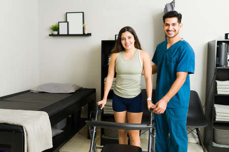 Portrait of a beautiful young woman using a walker and handsome physical therapist ready to start rehabilitation exercises