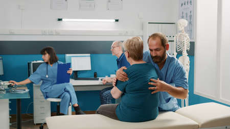 Medical assistant raising arms of elder person to stretch muscles and treat physical injury. Osteopathy specialist doing mobility exercise with senior man at physiotherapy appointment.