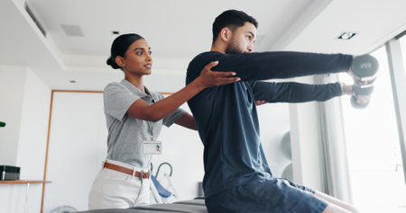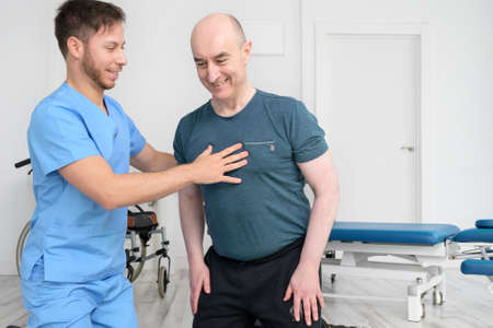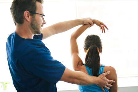 Doctor physiotherapist assisting a male patient while giving exercising treatment massaging the shoulder of patient in a physio room, rehabilitation physiotherapy concept.