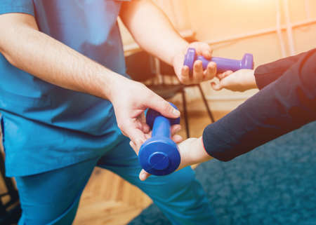 Man on wheelchair holds dumbbell in his hands. Doctor and young man in wheelchair. Treatment and restoration lost functions. Rehabilitation after injuries. Restoration motor functions hand