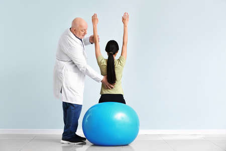 Physical therapist examines girl with spinal deformity on procedure at rehabilitation center