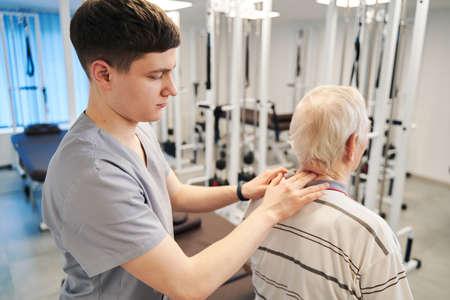 Young physical therapist pressing on pensioner neck with two fingers