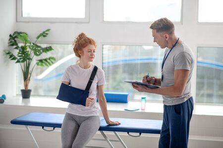 At rehabilitation center. Male physiotherapist writing prescriptions, female patient sitting on couch in arm sling