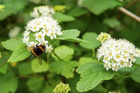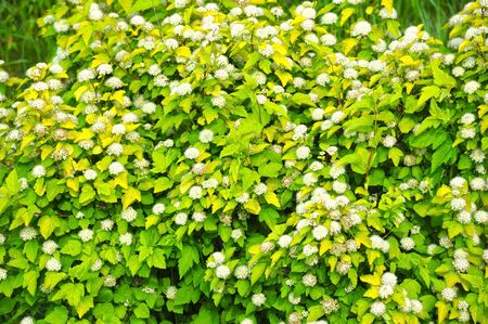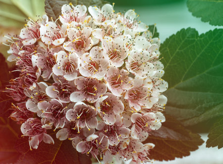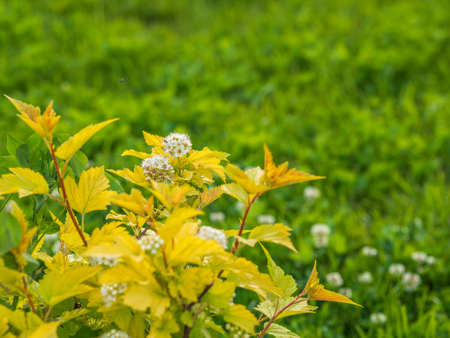Blooming Physocarpus opulifolius bush in the garden, closeup