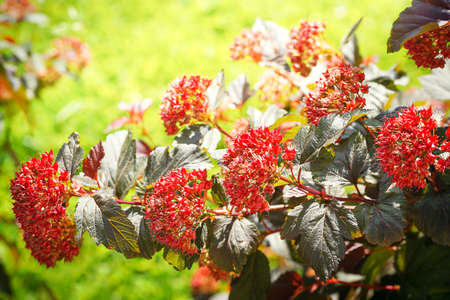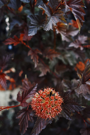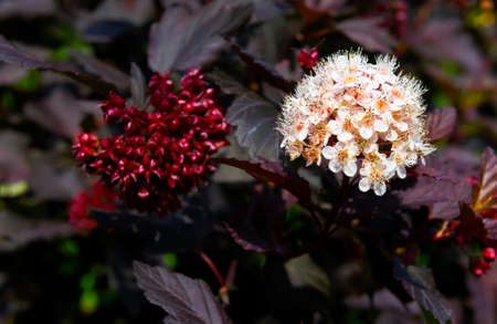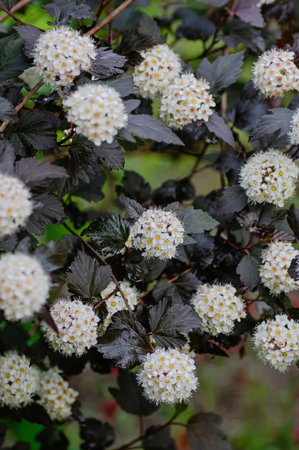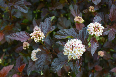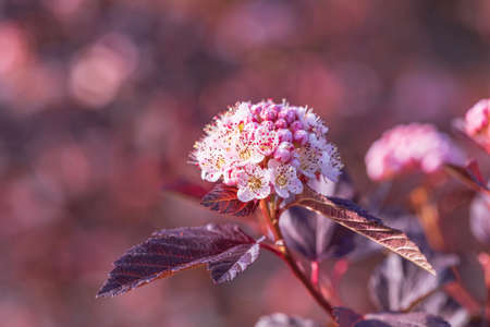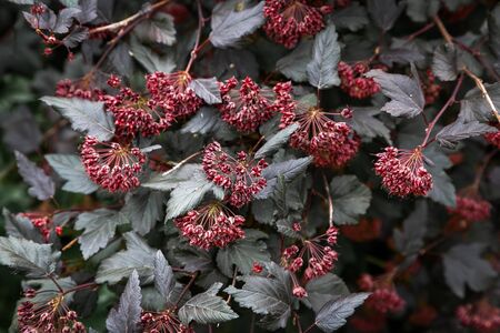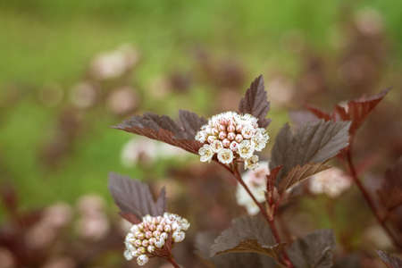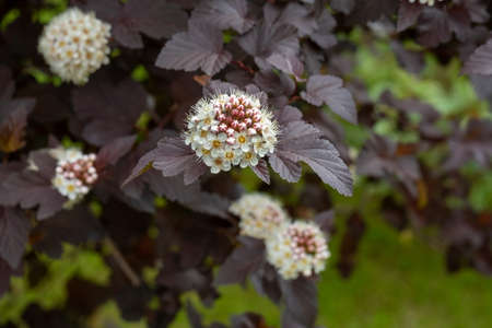 Ninebark or Physocarpus opulifolius shrub bloosom in garden. Dwarf shrub with deep red foliage for landscape gardening