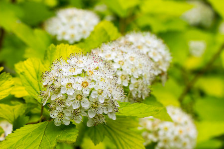 Close up of Spring Flowering Spireas Spiraea betulifolia. Tor spirea with white bloom. White bloom Shrub.