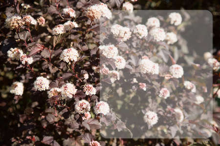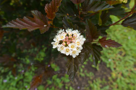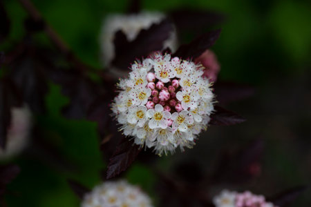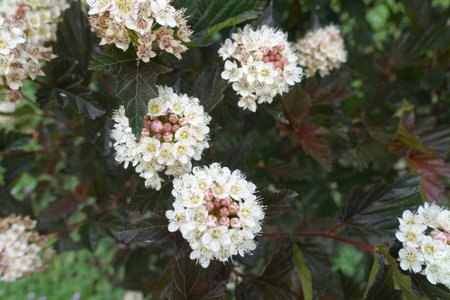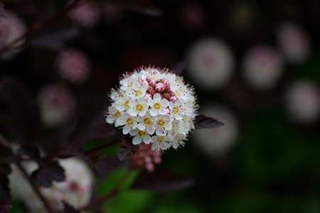 Flowers of an ornamental garden shrub of Vine-leaved spirea with dark burgundy leaves.