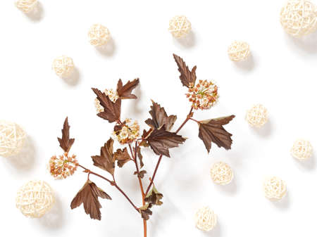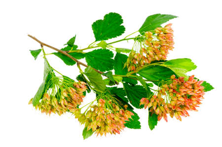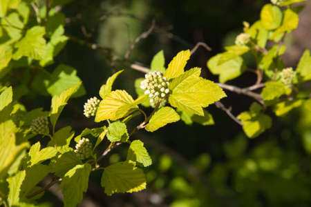 Branch with white flowers and green leaves Physocarpus opulifolius