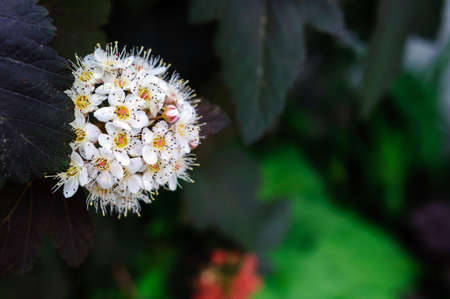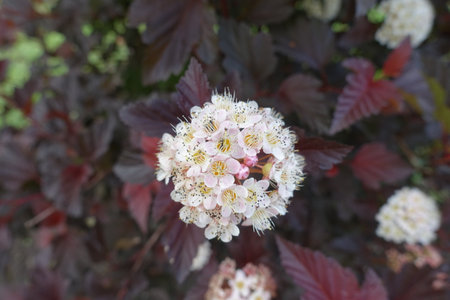 Panicle of white flowers in purple leafage of Physocarpus opulifolius in May