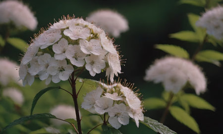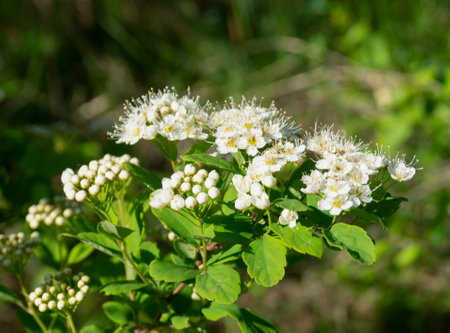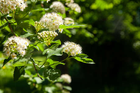 Close up of little white flowers at the tip of a bush branch. Blooming bush with green leaves and white flowers with shallow depth of field and selective focus
