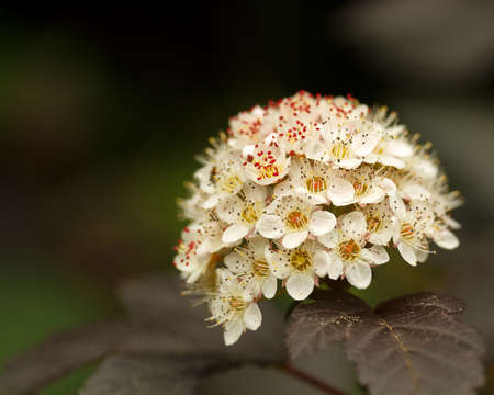Opening white flowers of purple leaved Physocarpus opulifolius in June