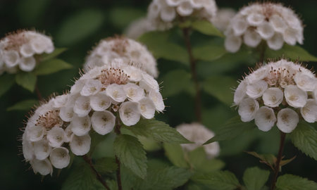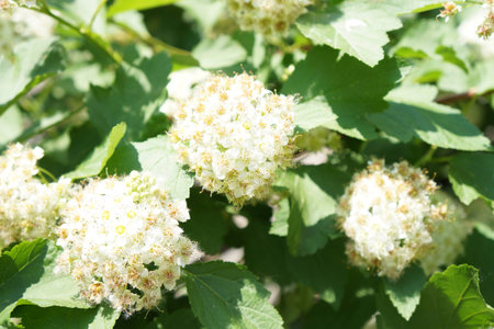 White flower clusters of Common ninebark, or Physocarpus opulifolius, in a garden