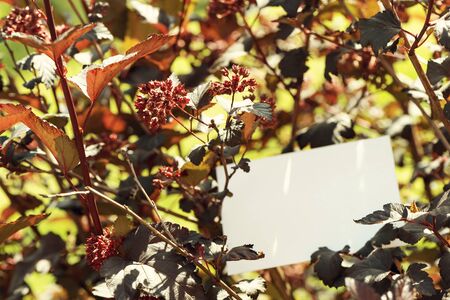 Mock up paper white card on green leaves. Creative layout with nature concept. Leaf, background, logo, sign, board, frame, copy space, minimal style.