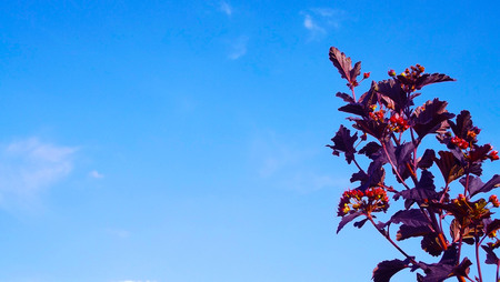 A sprig of a flowering tree with Burgundy leaves against a blue sky.