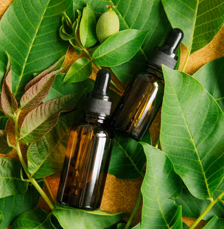 Two bottles of dark glass with walnut oil. Cosmetic and medical product.Walnut leaves on the background. Skin and hair care.