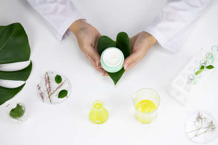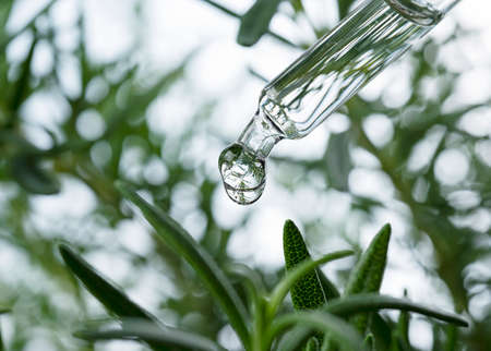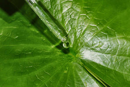 Natural extraction, Scientist drop essence for plant test, Alternative organic green herb plant medicine, Skincare beauty products, Biology research and development concept.