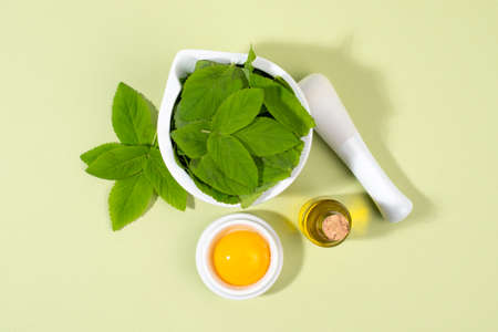 Goutweed (Aegopodium podagraria) leaves, egg yolk, and oil for making facial mask. Home made beauty product. DIY goutweed facial mask recipe. Natural beauty treatment. Top view.
