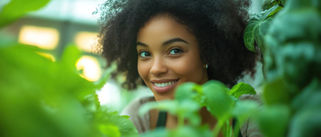 Woman gardening in a greenhouse, surrounded by lush plants, smiling and focused