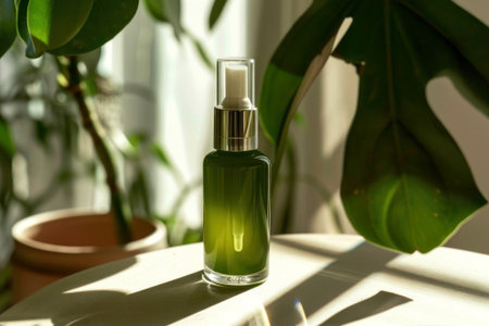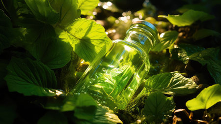 Discover the elegance of nature with this vibrant green bottle surrounded by lush leaves. Perfect for a serene and stylish atmosphere. Generated A.I.