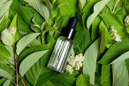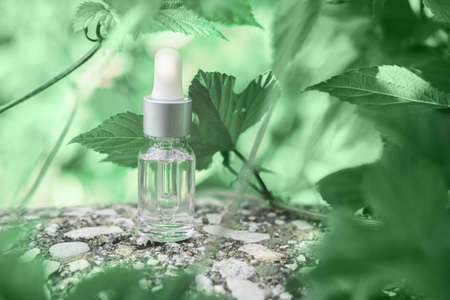 Bottle of herbal essential oil in a green tropical garden, natural scent and organic cosmetics concept