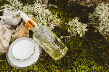 Natural eco-friendly organic cosmetics on the background of moss, leaves and tree bark.