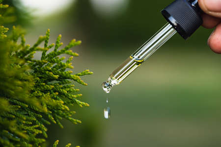 Pine essential oil dripping from pipette. Aromatherapy, spa, massage concept.