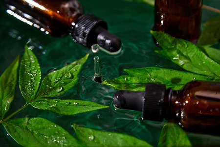 Bottle with herbal serum, oil cosmetic ad, simple and natural skincare concept, product mock up set with water ripple aside with green leaf