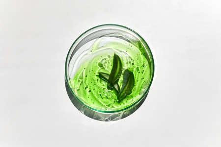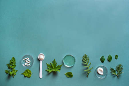 Natural skin care products in petri dish and green leaves on green background, top view, copy space. Natural eco beauty, herbal cosmetic laboratory and organic skin care concept.