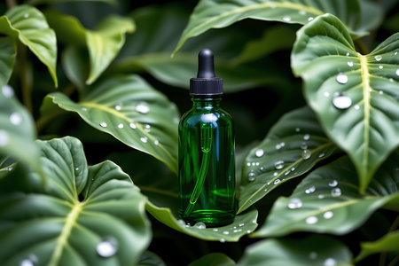 The bottle should have no label, no text, no logo, and no images or decorative elements on it Green essential oil bottle surrounded by tropical leaves, dewdrops on the leaves, moody lighting, jungle theme