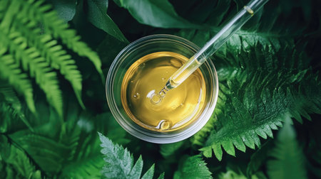 Petri dish containing organic skincare product swatches with a dropper, elegantly placed among vibrant green foliage.
