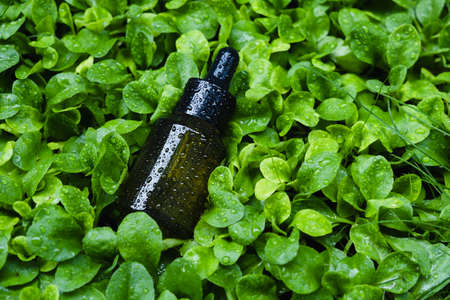 Green dropper bottle with black lid with drops on a green grass background. Natural sunshine and shadows. Skincare products, natural cosmetic. Beauty concept for face and body care