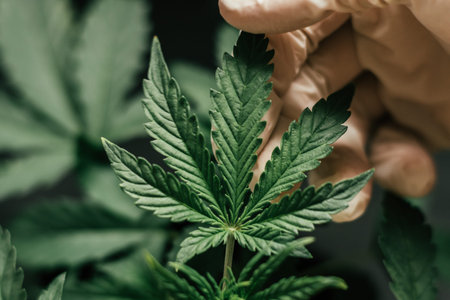 Hand of medical worker and plant and leaves of cannabis macro beautiful background, indoor cultivation