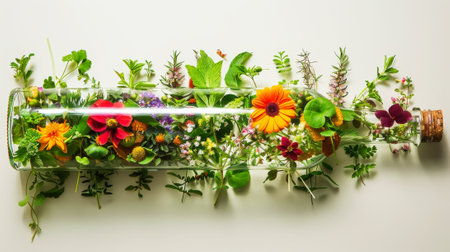 Variety of medicinal herbs and flowers in a bottle. Alternative herbal medicine. Homeopathic concept. Generative AI.