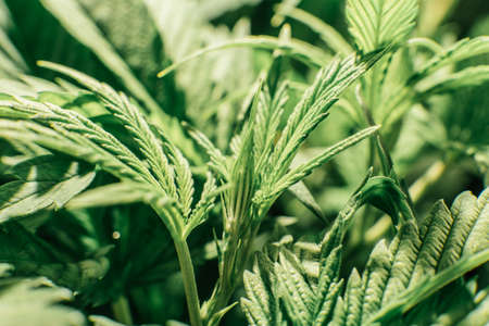 Growing cbd thc weed. Indoor cannabis grow medical. Green sativa background.