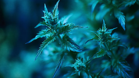 A close-up shot of serrated leaves, bathed in a cool, blue light. The deep shadows create a moody and mysterious atmosphere, highlighting the intricate details of the plant.