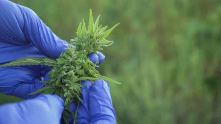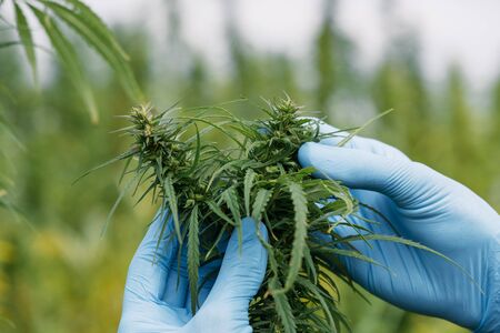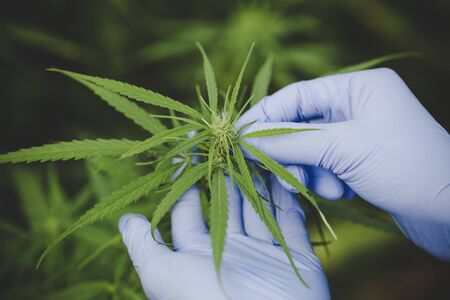 close up scientist hand gloves checking hemp plant. Concept herbal alternative medicine, cbd