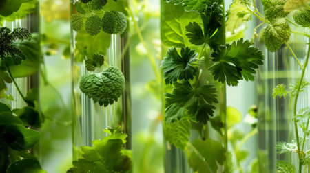 An array of green leafy plants and vines growing within transparent tubes of nutrientfilled water